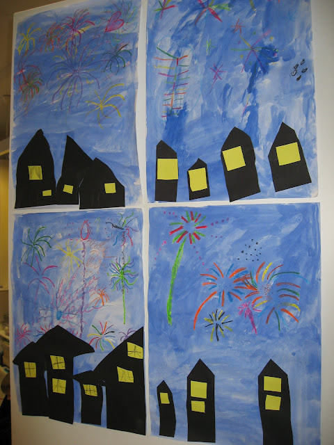 Raketit on piirretty valkoiselle paperille vahaliiduilla. Paperi on maalattu sinisellä vesivärillä. Työn kuivuttua mustasta piirustuspaperista leikattiin taloja ja keltaisesta paperista ikkunoita.